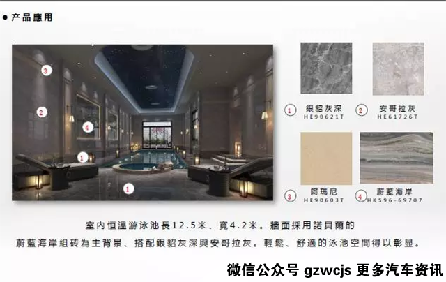 游泳池的墙面与地面同样使用了四款诺贝尔瓷抛砖。
