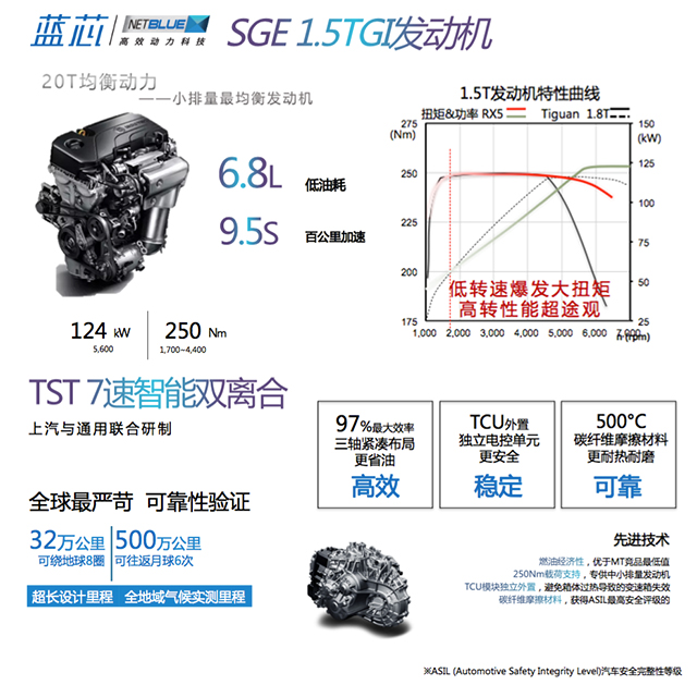 然后重点来了,要说说20T自动版全系所搭配的SGE 1.5TGI缸内中置直喷涡轮增压发动机(名字真长,代号15E4E)搭配7速TST干式双离合。这套动力总成是上汽蓝芯战略的重要组成部分,与北美通用联合研发,在上汽临港基地发动机工厂全本土化生产。虽说是共同研发,实际上就是共用图纸而已,生产、改良、标定什么的都是上汽自个搞定。负责标定的是上汽技术中心副总工程师仇杰先生为主的团队,仇工在动力总成标定方面已有18年的经验(以前任职通用泛亚),整个变数箱的软件逻辑控制,都是完全自主的。该款7速双离合也经过了500万公里台架+极限环境的测试,是一款相当成熟可靠的双离合变速箱。