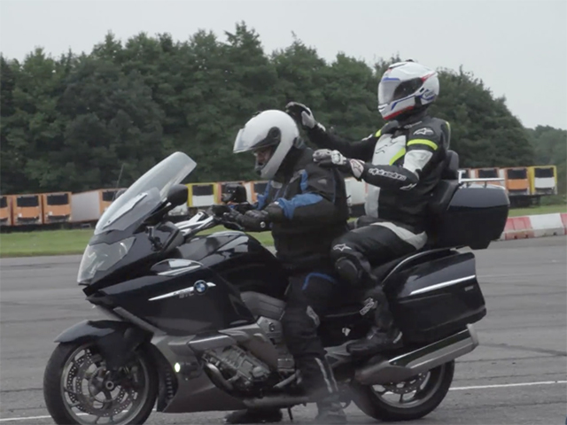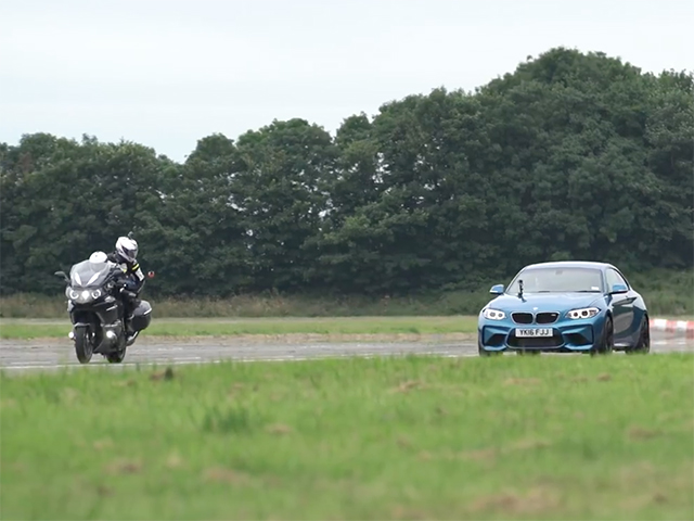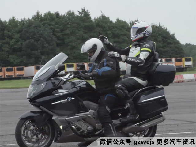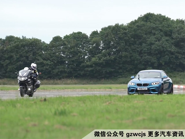 其实不用比都知道,摩托车比起汽车的优势在于车重轻,所以在第二回合比试中,M2的对手就换成了另一台宝马摩托-K1600 GTL。这辆巡航摩托车虽然块头稍大,车重近350kg,而且还带有一系列在摩托车中算是豪华的配置,不过搭载1.6L六缸发动机之后,最大动力输出为158马力和175牛米扭矩,为了让M2输得不太惨,K1600 GTL还玩了玩双飞,后座上载人直接比试。