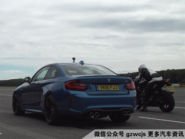 很不幸的是,今天的四轮VS两轮加速,都是宝马的家伙。四轮的就是今年风头颇旺的宝马M2,而两轮的则是宝马自家的超跑摩托S1000RR。M2大家都熟悉得多了,S1000RR是什么来头?这辆S1000RR正是宝马的公升级跑车,其搭载1.0L四缸发动机能爆发出199马力,112牛米的动力输出,车重200kg出头,虽然在比试中,起步不及M2迅速,但是在中后段直接就完爆了M2。