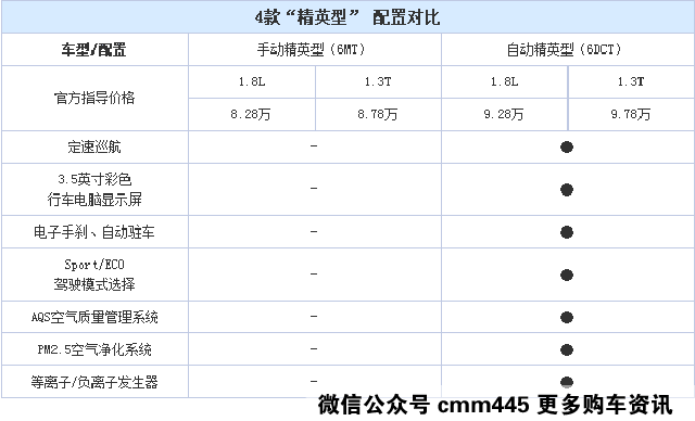 新车有1.8L和1.3T两种动力选择,共计七款车型。并有8种颜色可供消费者选择,还是老规矩,1.8L车型将获得厂家提供的3000元补贴。