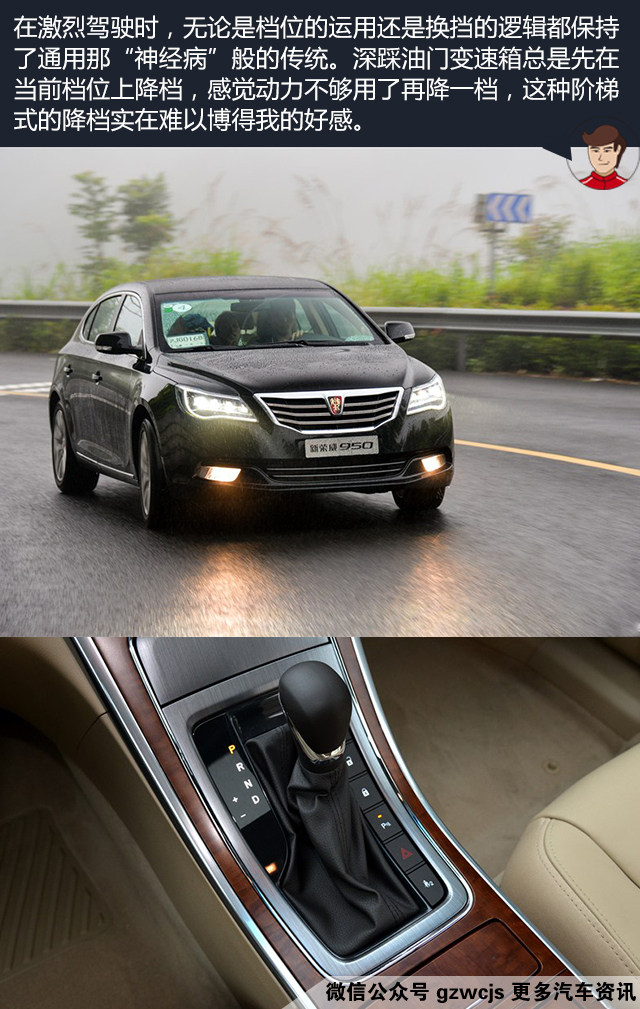 与荣威950这台直喷发动机相搭配的同样是来自于君越的6AT手自一体变速箱。既然动力总成相同,相必驾驶感觉和君越的也极为相似。日常驾驶,变速箱的平顺性值得称道,并且变速箱的齿比设计也较合理,换挡的动作以及效率都比较能让人满意,但这也只是日常驾驶,一旦当你心血来潮想要压榨发动机动力时,这台发动机的变现就显得不是那么利索了。