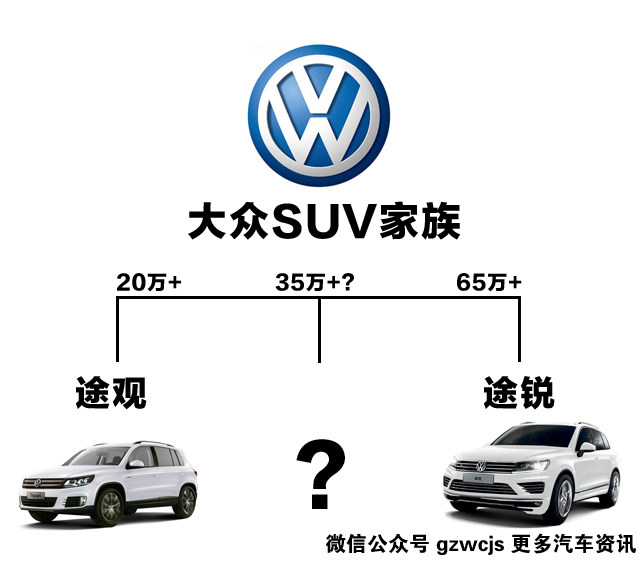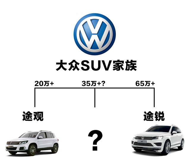 途观作为紧凑型SUV,售价在20-30万的区间,而作为进口身份的途锐,定位为中大型SUV,起售价最低为65万元。由上图我们可以看出,大众SUV家族中在 30-50万区间的SUV车型还是一片空白,缺少了这一块SUV市场的竞争力。