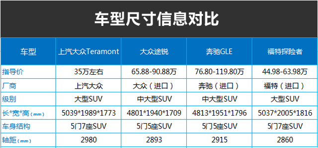 从上图可以看出,无论和价位更高的大众进口途锐,还是另外两款进口身份的大型SUV相比,上汽大众Teramont在身型尺寸上占据了一定优势,同时大家也千万不要忽略了它的价钱,因为它的价格是定在35万元左右,价格才是最大的优势所在。