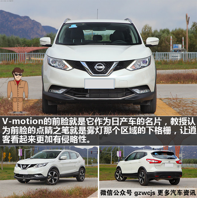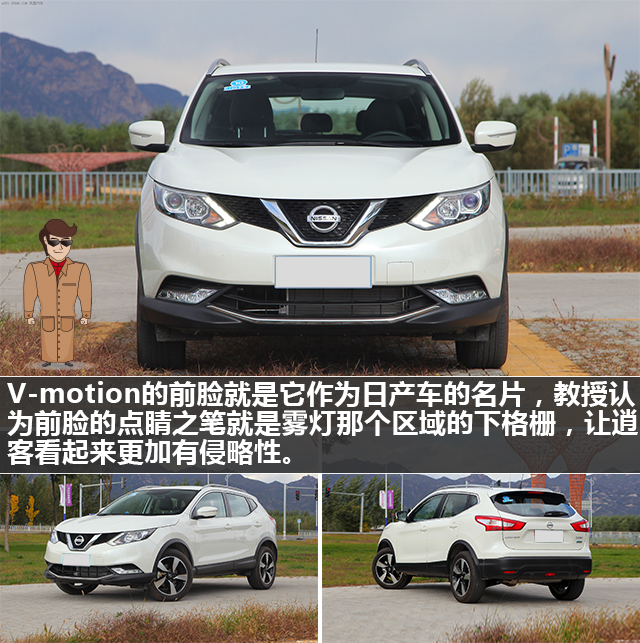 逍客的外观设计采用了和奇骏一样的设计风格,V-motion的前脸就是它作为日产车的名片。教授认为前脸的点睛之笔就是雾灯那个区域的下格栅,让逍客看起来更加有侵略性。