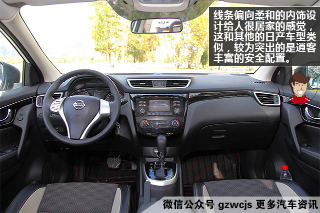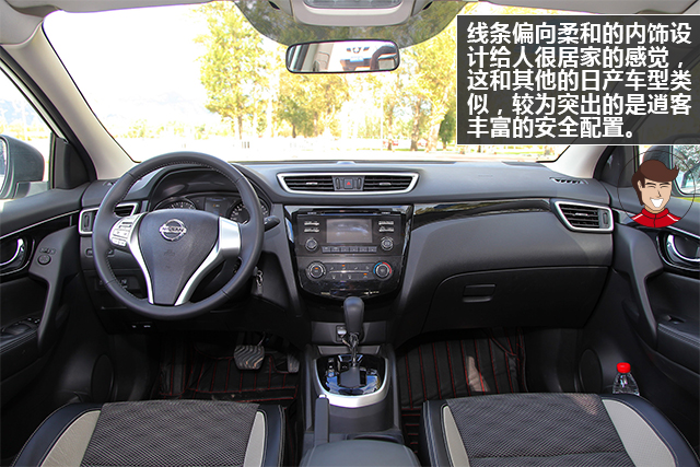 走进车厢,线条偏向柔和的内饰设计给人很居家的感觉,这和其他的日产车型类似。较为突出的是逍客的安全配置,如全景式监控影像系统、盲区预警、车道偏离预警和预碰撞智能刹车辅助系统等等。