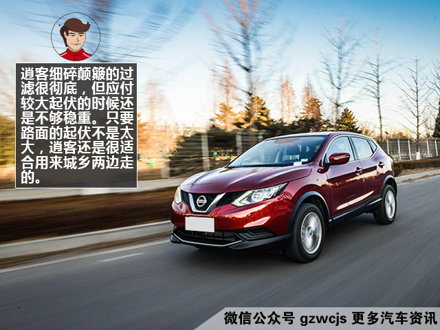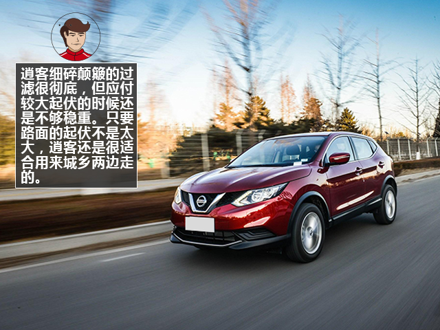 至于底盘,在欧洲,逍客的设定是偏向于运动化的,但是进入中国后,通过加入减震胶垫和隔音材料,让逍客的行驶表现更偏向于舒适。的确,它对细碎颠簸的过滤很彻底,但应付较大起伏的时候还是不够稳重。只要路面的起伏不是太大,逍客还是很适合用来城乡两边走的。