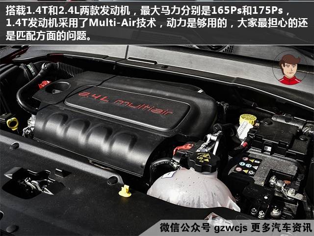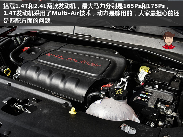 动力方面,搭载1.4T和2.4L两款发动机,最大马力分别是165Ps和175Ps,1.4T发动机采用了Multi-Air技术,动力是够用的,大家最担心的还是匹配方面的问题。对于7速双离合的车型,大部分时间都能做到输出平顺,只是低速行驶和频繁起停的过程会有些许顿挫或抖动,整体的表现对于不是很敏感的人来说不会有太大问题。