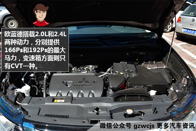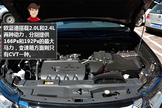 欧蓝德搭载2.0L和2.4L两种动力,分别提供166Ps和192Ps的最大马力,变速箱方面则只有CVT一种。对于1.5吨车重的欧蓝德来说,192Ps的马力是足够的,稍微拉高转速,超车也是轻快利落的事情。