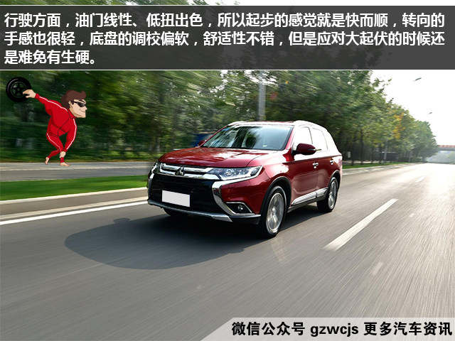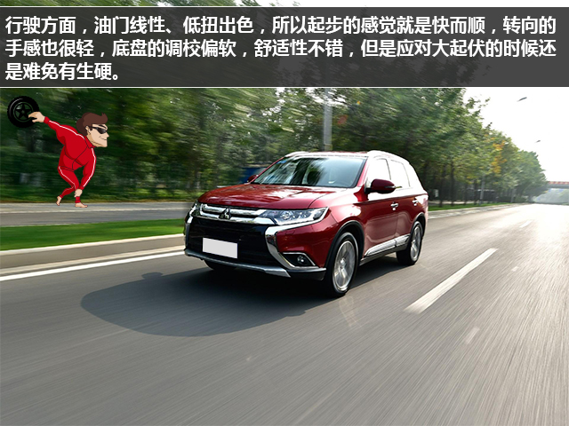 行驶方面,油门线性、低扭出色,所以起步的感觉就是快而顺,转向的手感也很轻,底盘的调校偏软,舒适性不错,但是应对大起伏的时候还是难免有生硬。虽然跑烂路的时候舒适性会明显下降,但是欧蓝德的通过性还是能够满足小强度越野,毕竟它的四驱系统还是有一定的脱困能力的。