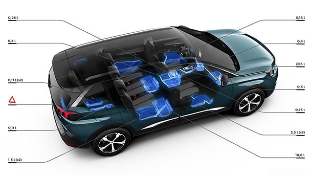 虽然5008实车(长/宽/高4641*1844*1646)看起来没有图片那么大,但比新近上市的竞争车型途观L(长/宽/高4712*1839*1673)和科迪亚克还是略具优势。另外5008的轴距达到了2840mm,比起途观L和科迪亚克的2791mm要增长不少。