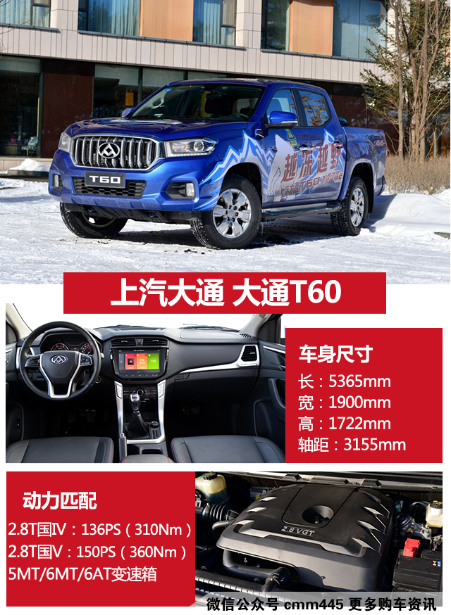 从外观上看,大通T60的前脸很像最近回归的德系品牌——宝沃,整体看上去挺有霸气的。内饰设计可以媲美国内SUV车型,配置也十分丰富。为了证明质量,上汽大通还把这款皮卡拉去做冰雪试驾。要知道,这款车只有搭载柴油发动机,说明上汽大通对于自己的技术非常自信。