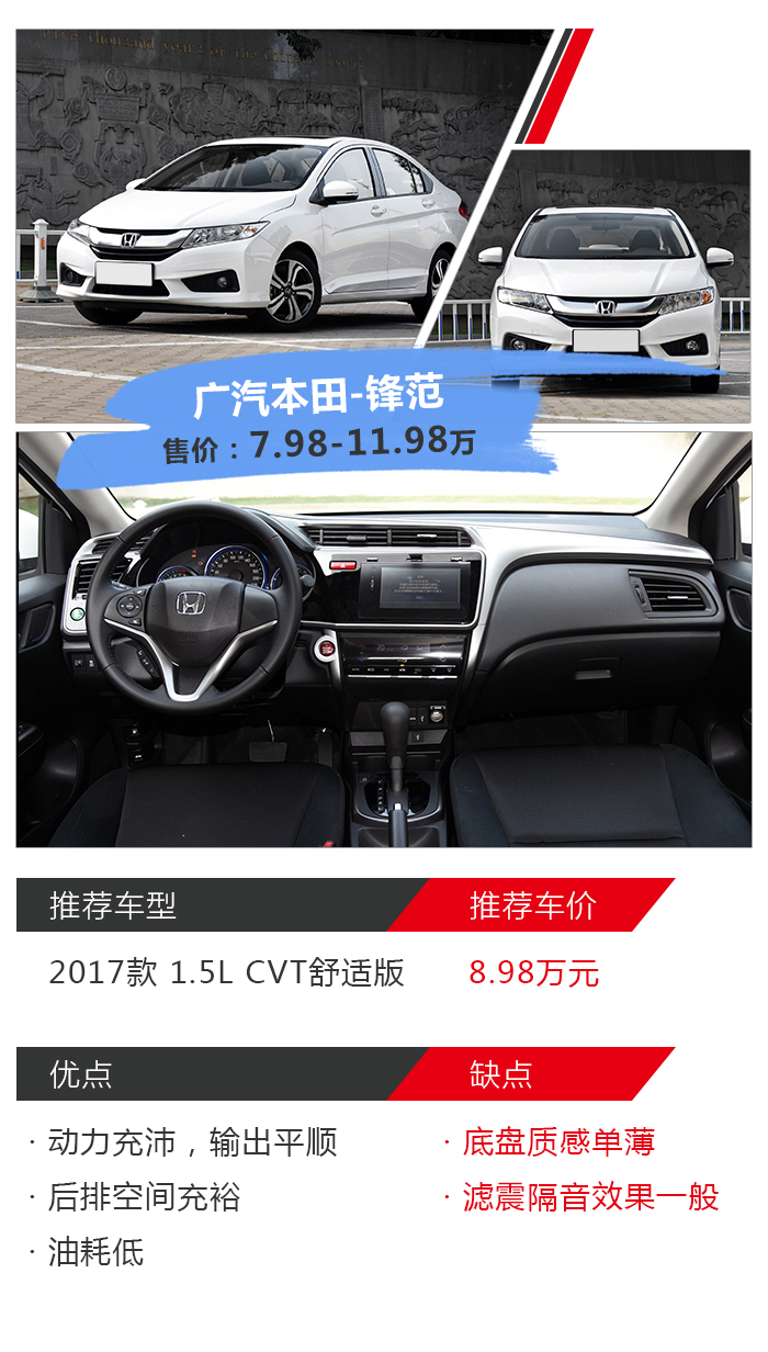 十万元左右的小轿车,一直都是汽车市场里销量最火爆的一个细分市场,而买这些车的人都有一个共性,就是都看重实用性和性价比。对于他们来说,花哨的配置和爆炸的动力都不是最吸引的,相反,偏向平庸的动力表现还能带来比较平顺舒适的乘坐体验。所以这也是它们性能不出众,但依然能保证销量的原因了。的确,实用便宜才是王道,教授推荐的车型也就是根据这一原则来选的了。