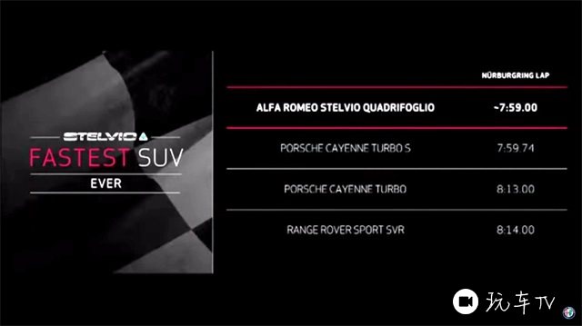 有着这样的故事突然就就得这个品牌一下吊炸天。但是光有故事怎么行,还得有酒啊,就在两台车开始卖之前就先后去了德国著名的“绿色地狱”真理之环---纽博格林(北环)赛道,其中Stelvio Quadrifoglio跑出7分59秒的最快单圈成绩,一举打破此前保时捷卡宴Turbo S 的记录成为有纽北史以来最快的SUV车型。