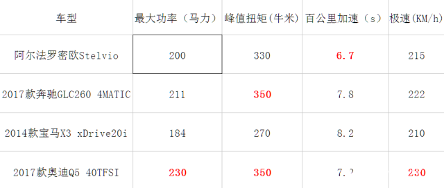 其中阿尔法罗密欧Stelvio Quadrifoglio高性能版搭载了来源于法拉利的2.9L V6双涡轮增压发动机,最大功率输出功率512马力,峰值扭矩600牛米,并配备一台8速自动变速箱,百公里加速耗时3.9秒,极速可达285公里/小时。
