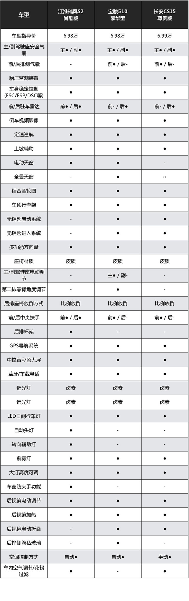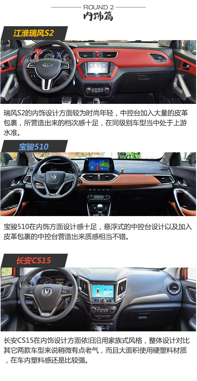 对比三款车型,其实在设计感方面都做得很不错,而且三款车的售价都在5-7万这一个价位区间,在内饰的用料方面主材料基本大多采用硬塑料材质,但是江淮瑞风S2与宝骏510加入了皮革装饰,无疑能带给我们更高档更上档次的质感。