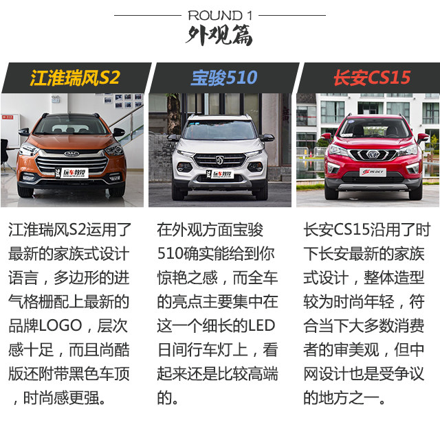 单纯从设计上看,你会发现江淮瑞风S2和长安CS15均使用上了各自家族式的设计,造型也比较年轻时尚,适合时下大多数消费者的审美眼光,而且今天所推荐的瑞风S2尚酷版还新增了三种撞色方案,典雅白、拉菲红、活力橙三款颜色搭配黑色车顶,省去日后贴黑车顶的烦恼。而对于宝骏510来说,则使用上了全新的设计语言,其中最大的看点在于它的日行灯造型上;另外长安CS15在造型方面也偏向于时尚年轻,只是颜值这方面一直都是以主观的形式存在,所以究竟哪一款更好看?还是得看消费者个人的审美观。