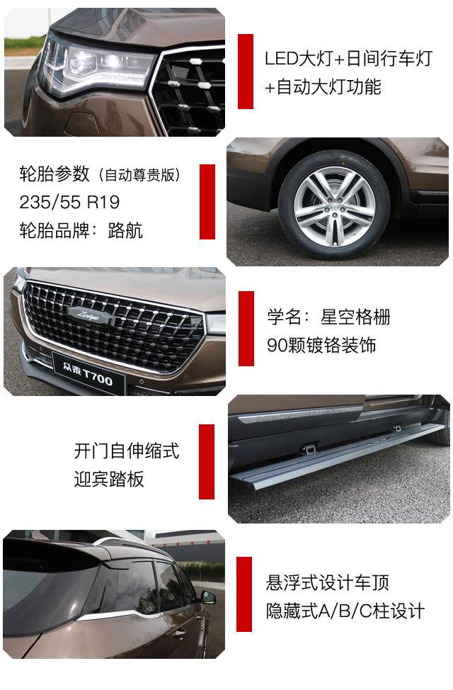 不同于众泰SR9,T700的外形可以说是有着不低的原创度,宽阔的大嘴配上类似“水钻”一般的镀铬饰件,确实让它看着颇为贵气。而且超大脚丫、LED大灯、悬浮式车顶等都标榜着它努力贴靠“豪华”的理念。