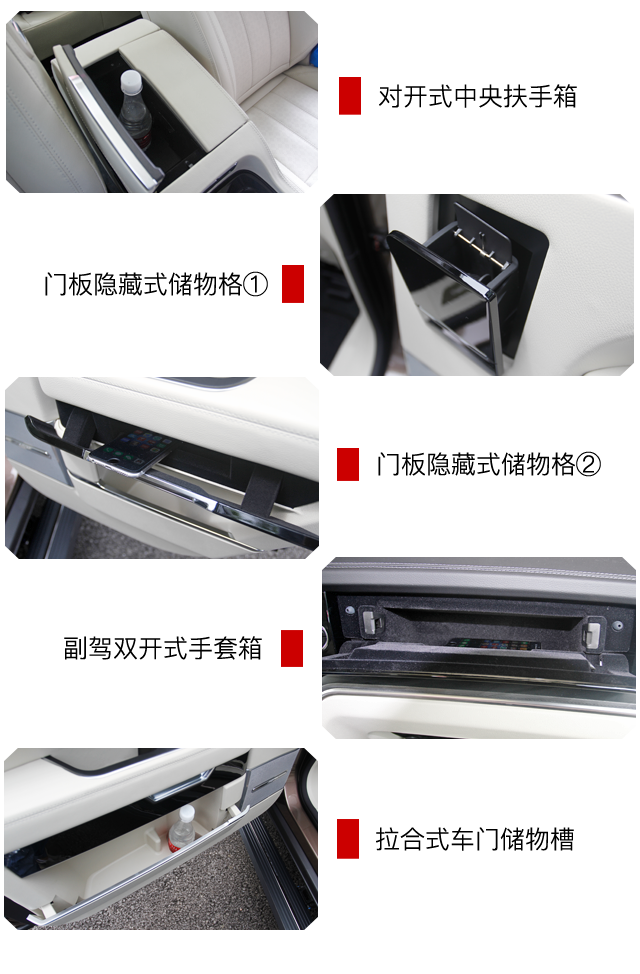 说到储物空间众泰T700也是相当会玩,除了前面提到的双层式副驾手套箱外,中央扶手对开式设计也挺有档次感,不过储物能力表现一般。此外,前后门板处都设置了隐藏储物格,这点当真很少在其他车型上能够看到。