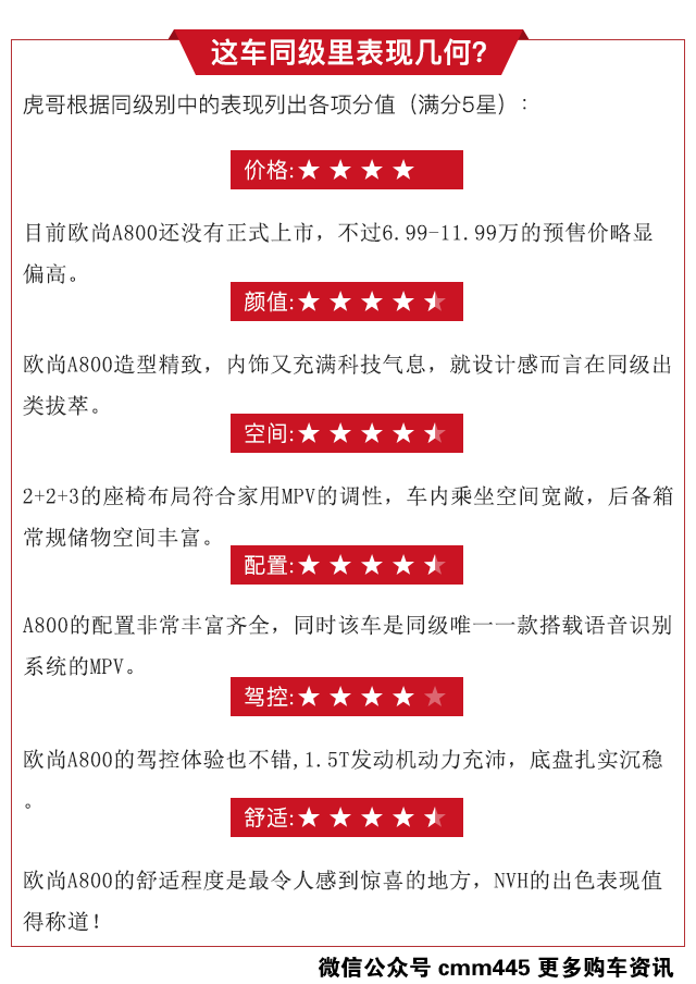 试驾完欧尚A800,虎哥感受到了长安的用心。消费者最希望看到的东西,包括精致的外观、丰富的配置、充足的动力,长安一个都没落下,在欧尚A800身上都有体现。按目前6.99-11.99万的预售价区间来分析,欧尚A800主力车型价格区间应该在8-9万元级别,配置水平大概为1.5T中配及自动挡入门版本车型。对比宝骏730,1.5T中配车型的核心竞争力在于配置,自动挡版本则胜在变速箱,如此看来A800的市场潜力还是很大的。至于A800能否翻盘730成为MPV新王者,还得等具体售价出来之后才能见分晓。