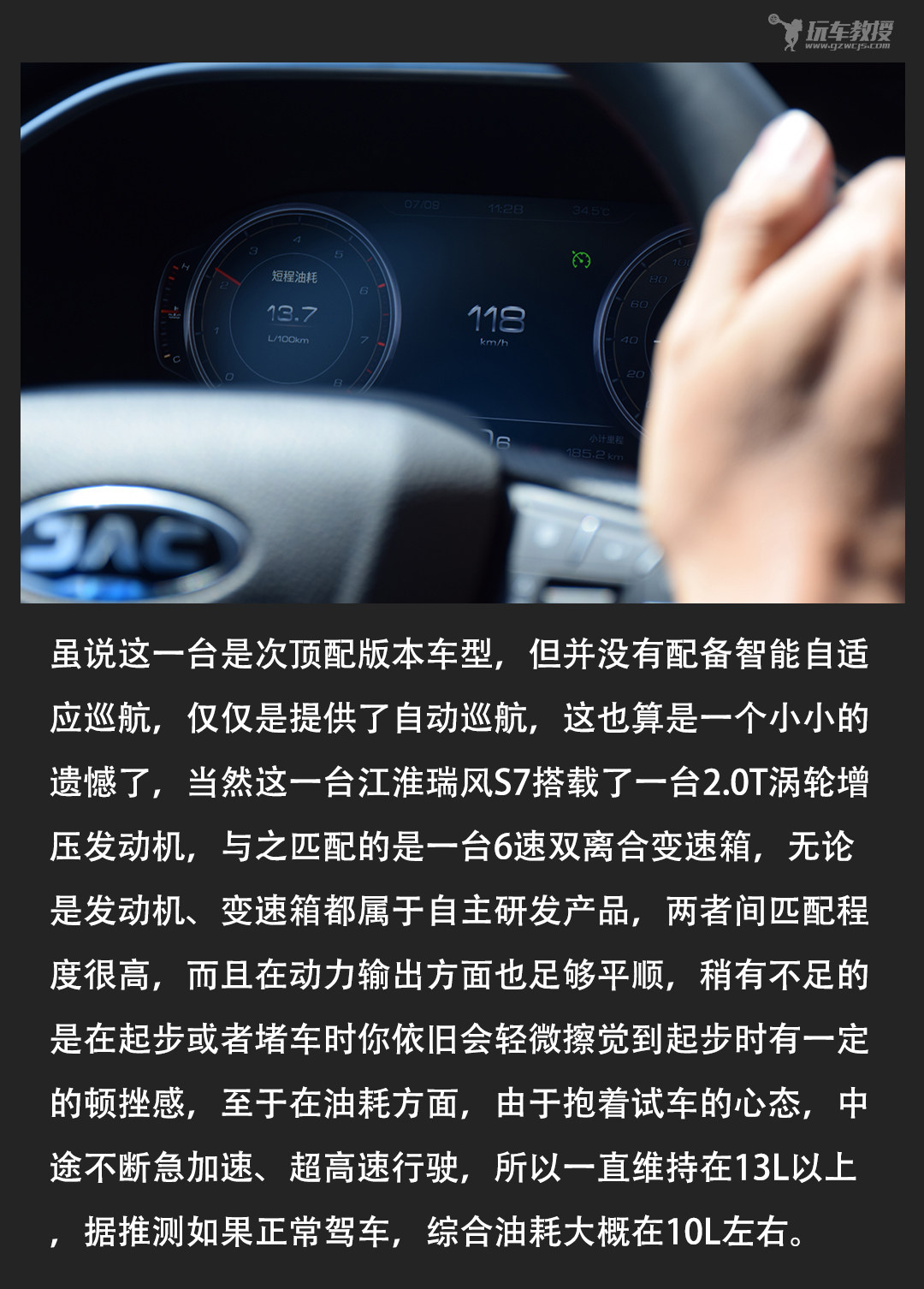 在教授看来,江淮瑞风S7也算得上市一款很不错的国产SUV,虽然在设计方面依然少不了借鉴模仿的痕迹,但是却能让自己的产品更容易让消费者接受,这真的重要吗?相比其它拿来主义的国产品牌来说,江淮还算得上是一个踏实搞钻研的品牌。在江淮瑞风S7上,用上了自主研发的发动机与双离合变速箱,有可能不被看好,但试驾过后你才知道这S7一套动力系统还是值得点赞的,如果能够解决起步时出现的轻微抖动问题,那就更为完美了,而对于这台瑞风S7来说,教授并没有找到明显的短板之处。说到最后,其实对于国产品牌车型来说,欠消费者的就是一个“质量”的口碑,车虽然已经做得很不错,但最关键的还是得保证整车质量,这才是赢得良好口碑的最关键一环。