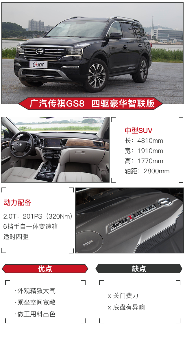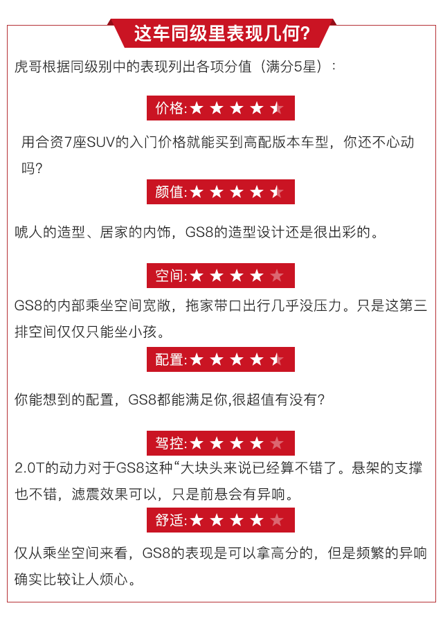 总的来说,GS8有不少值得称道的地方,譬如出色的车身造型、宽敞的内饰空间、完善的动力单元等,同价位的合资选手无出其右。但是,稍显遗憾的是,这次虎哥拿到的试驾车并不太完善,不能为大家做最全面完善的试驾展示,如果有意向购买四驱豪华智联版车型的朋友还需亲自到店试乘试驾一番。