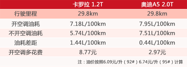 果然奥迪A5因为采用自动空调+大排量发动机,因此开启空调对油耗的影响比较小,行驶100公里开空调比不开空调多耗费0.44升油,也就是跑100公里多花2.97元钱。