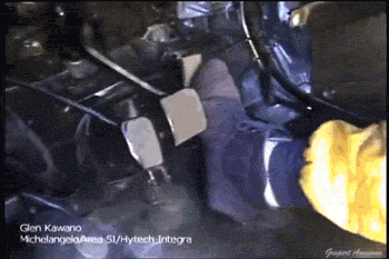 其实在专业的比赛当中,一个车手的脚法是至关重要的,因为对车辆的动力控制都是通过它来实现的。除了上文所述的“左脚刹车”外,我们还能经常见到他们用两只脚完成了对三个踏板的同时控制,也就是我们常说的“跟趾”动作。