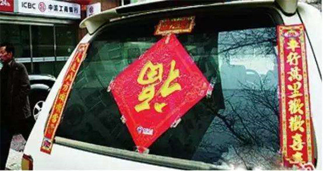 还有,在后挡风玻璃上摆对联,一个大福字,把后挡风玻璃档的挡得严严实实的,就算后面的车刹不住车也看不见吧?还怎么求平安。