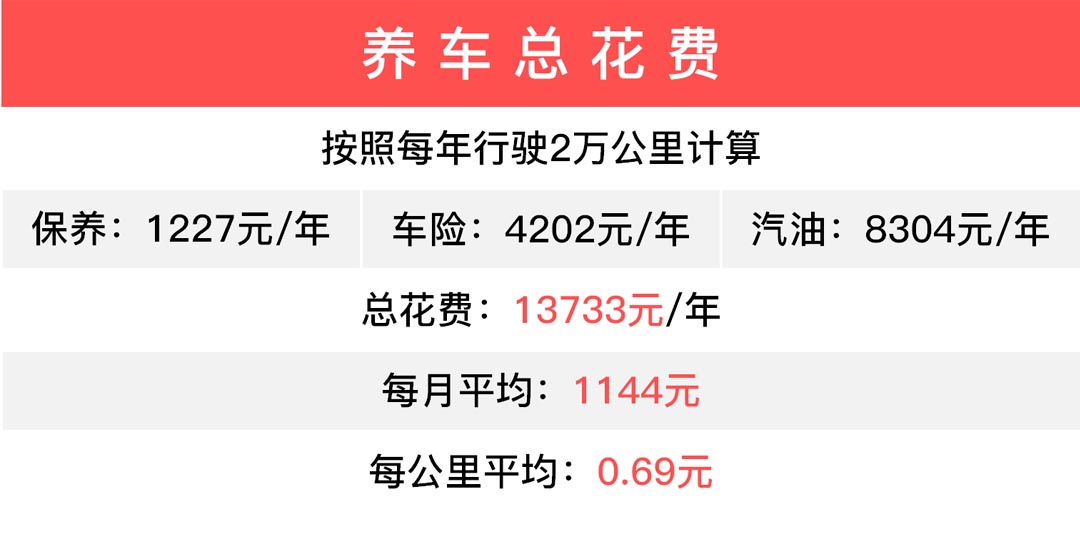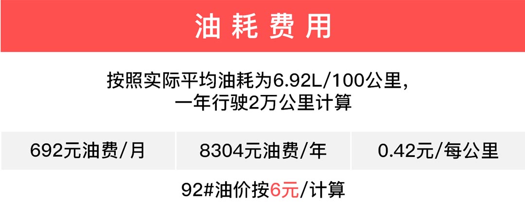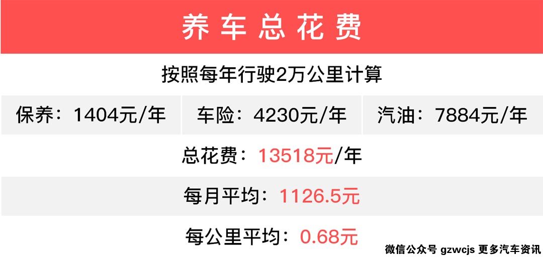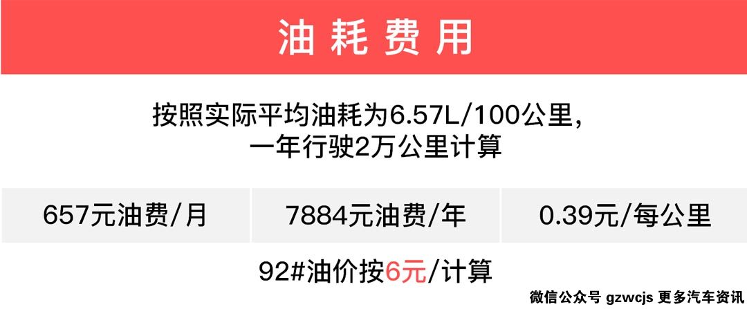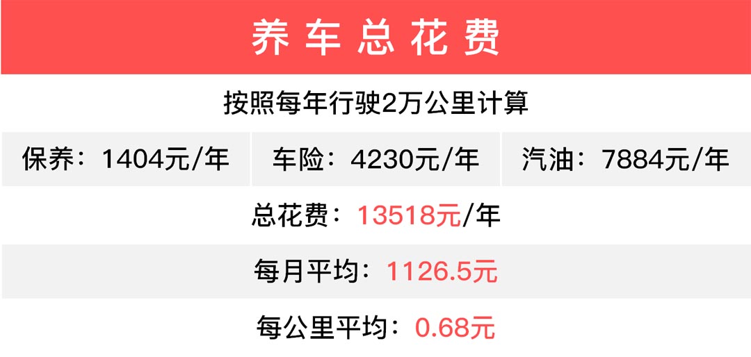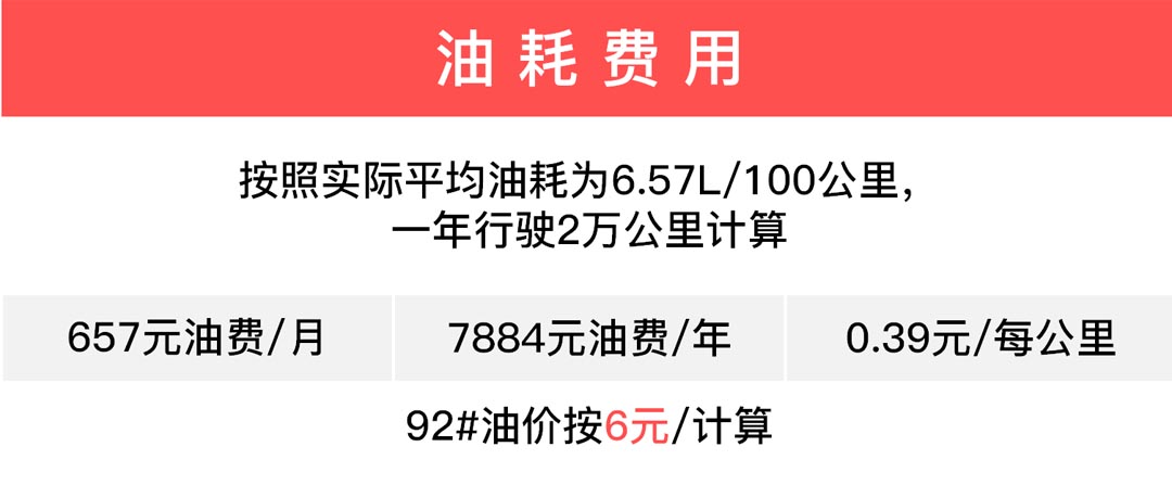 在油耗方面,0.39元每公里的成绩还是非常吸引消费者购买的。按照两万公里一年进行计算,每个月仅需要花费657元的油费。
