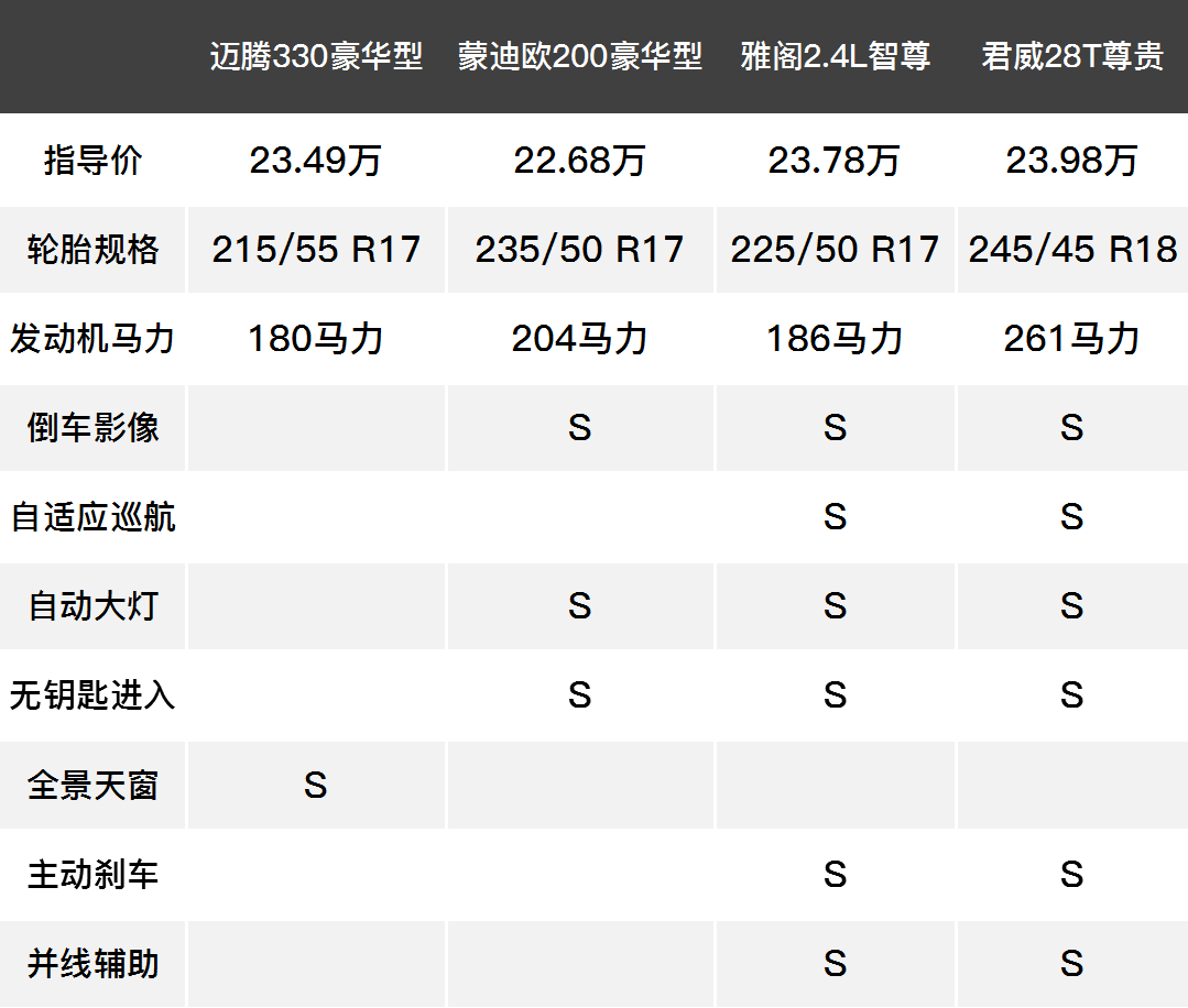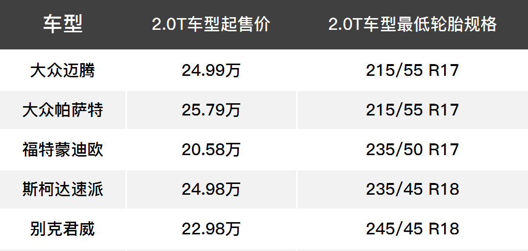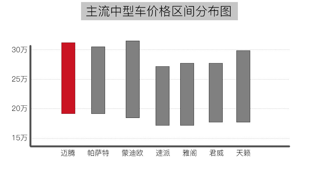从售价区间来看,迈腾是贵的,18.99万-31.69万的售价区间比大部分中型车都要高,足以看出迈腾自身的定位比较高;而与同价位车型相比,迈腾的性价比也不突出,与我们找的三款竞品对比,迈腾的轮胎是最窄的,发动机马力最小,配置也是比较低的,所以从这个角度来看迈腾依然不便宜。
