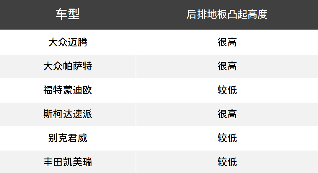 迈腾不仅保持了大众车一贯的德味,还顺带保留了大众特色的后排超高地板凸起,地板的凸起高度比一台苹果6 plus还要高出一截,这就使得中间座位的乘客舒适性大打折扣了,说实话在如今这个越来越推崇全平地板的时代,大众还做这么高的地板真的是很难理解。