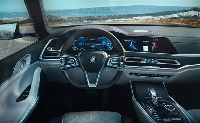 作为一台代表未来的概念车,宝马X7概念车的内饰设计非常科幻,但布局上基本没有太多改变。仪表盘采用全液晶的设计,而熟知的鸡腿档把也换成了类似全金属式样式。而从上方俯视图能够看到,宝马X7会采用7座布局,这也证实了这台X7的目的就是为了与奔驰GLS抢占市场。
