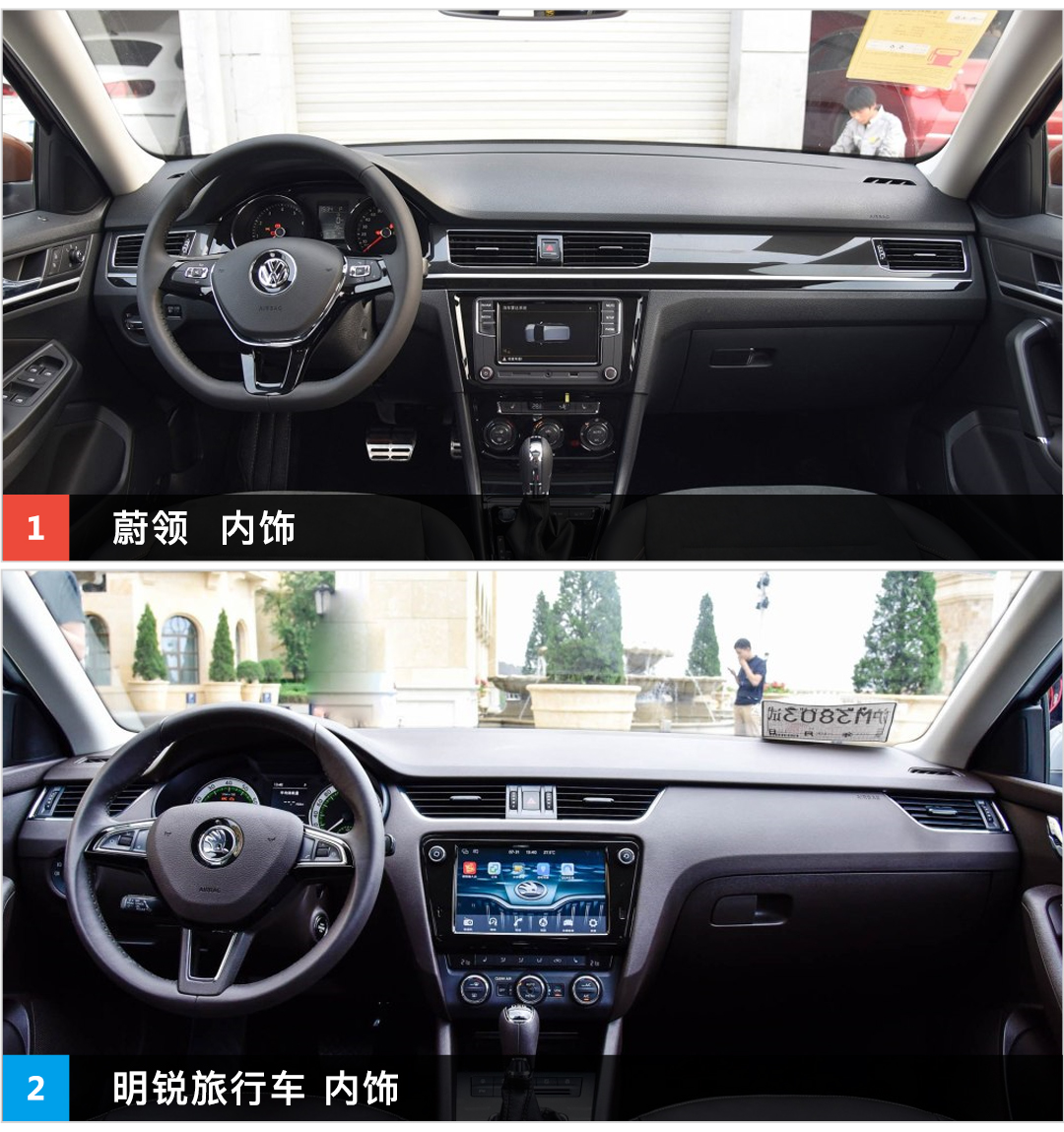 两车的内饰的风格和布局有点相似,都是典型的大众风格,不过细节上还是有分别,明锐旅行车在手能触及的地方都采用软性的材质,比较有档次感。蔚领中控台全部采用硬塑料材质,但贯穿的饰板还是能提升下质感,平底的方向盘相对更显运动。