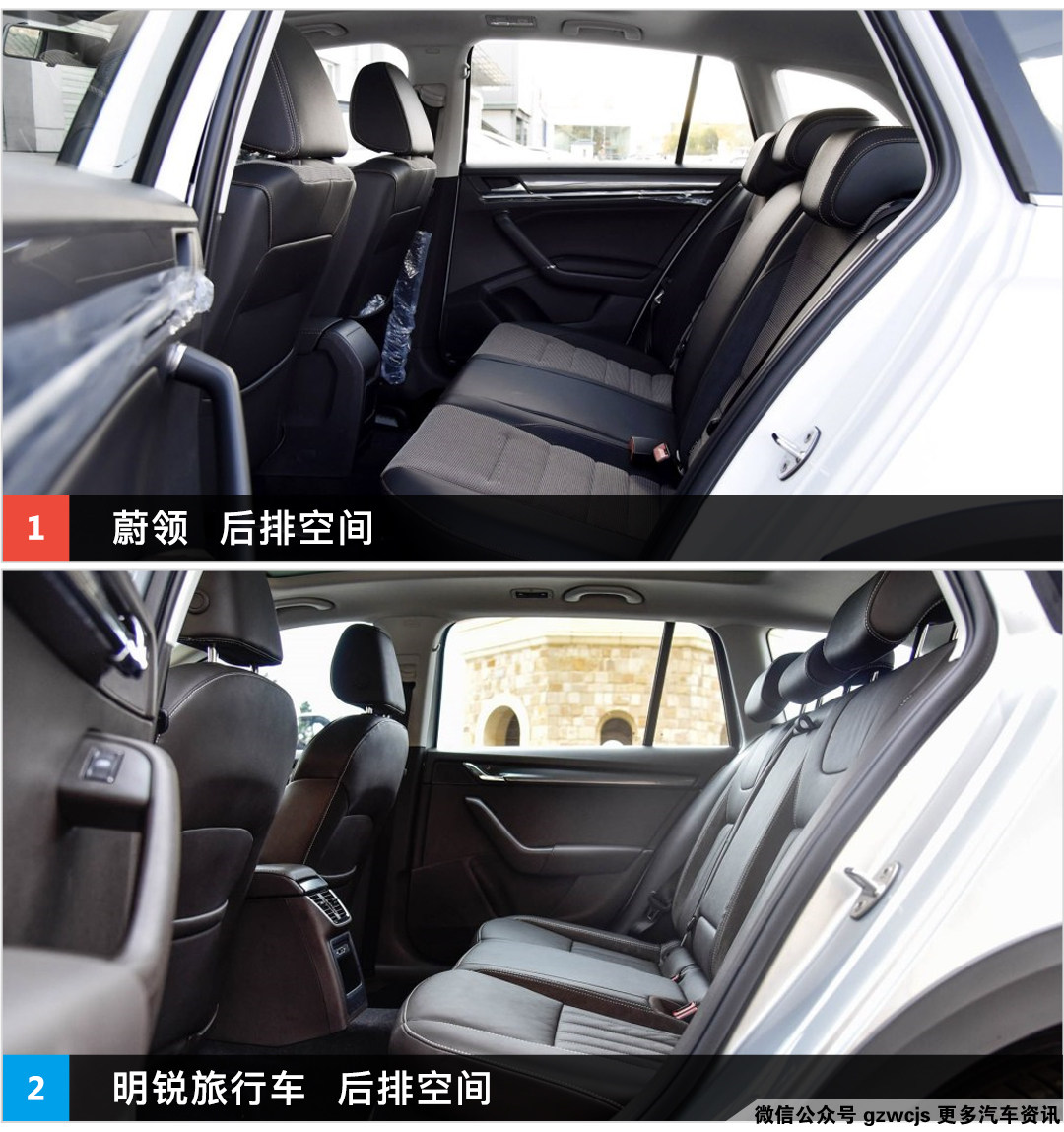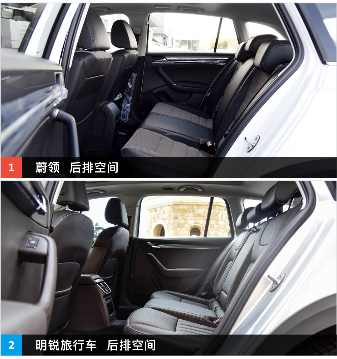作为旅行车,空间无疑是消费者十分看重的。两车的空间表现都比较出色,相比之下,明锐旅行车在车身尺寸上稍占上风,不过后排的表现差不多,差距主要是后备厢。明锐旅行车的后备厢空间容量达到了610L,后排座椅可以4/6放倒,放倒后排座椅可以扩充到1740L。蔚领的后备厢容量为589L,后排座椅4/6放倒后可以扩展到1507L,放倒比较平整,可以方便放大件物品。