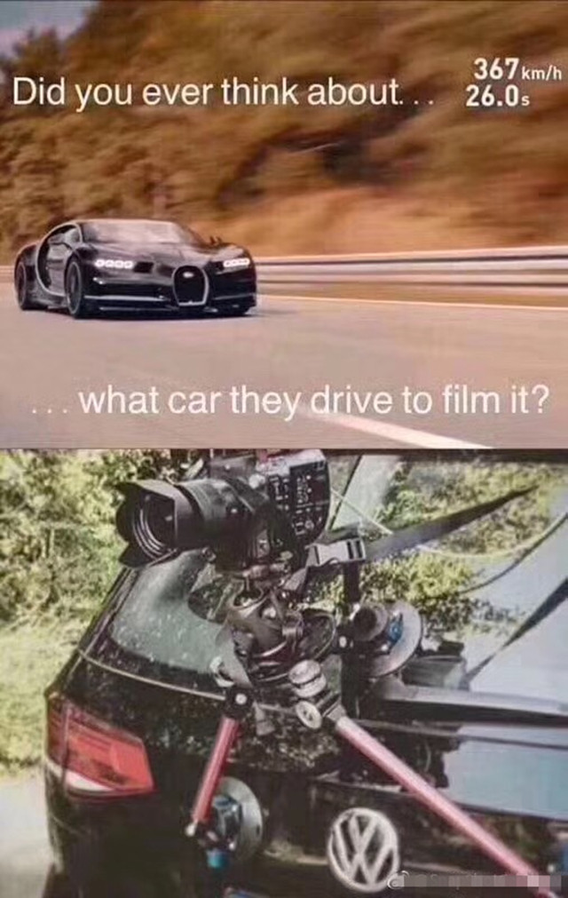 比如前段时间布加迪Chiron创造了惊为天人的“42”纪录(0-400-0km/h仅仅用时42秒),在视屏中显然大家更关心的是,究竟是何等拍摄车才能跟上如此变态的Chiron?于是网上就流传了这么一张图片:
