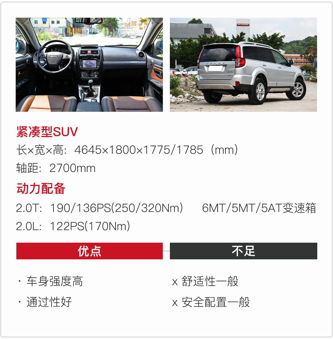 如今提起哈弗,大多数人都只知道哈弗H6、哈弗H7了。然而在哈弗旗下,其实还有一款性价比颇高的SUV---哈弗H5。如果你经常得载着人、货上山下乡,那哈弗H5绝对是你最好不过的选择。哈弗H5采用了强度极高的非承载式车身,再崎岖的烂路都能够保证车身的整体性。其还拥有225mm的最小离地间隙、28°的接近角以及31°的离去角,面对坑坑洼洼更具有通过的能力。既然都如此硬派了,哈弗H5干脆也提供了汽油发动机以及柴油发动机两种动力,其中2.0T的柴油发动机能够提供320Nm的最大扭矩。在配置上,哈弗H5虽然不及哈弗H6那样丰富,那对于那些经常出入乡村郊外的人来说,这实打实的通过性才是最重要的。至于家用,能宽宽松松坐下5个人就足够了。