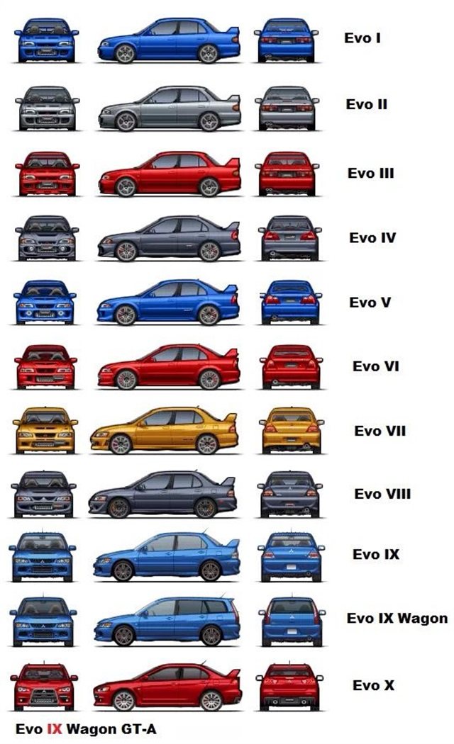 和老对手STi一样,EVO的诞生纯粹是为了参加比赛,因此也有其平民车型的原型车,那就是Lancer,至于为什么叫Evolution,其中一个原因就是因为其进化得非常快,Lancer从初代至EVO停产的时候总共才5代车型,而第一代EVO则是在第三代Lancer的基础上进化,也就是说在三代Lancer的更新期间,EVO足足进化了十代车型(准确来说是12代)。