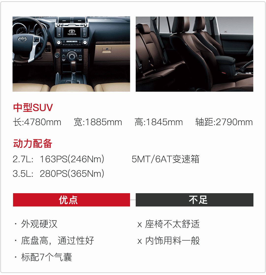 当然,作为越野派的经典车型,普拉多有着扭力强悍的发动机,丰田品牌扎实牢靠的品控能力,它的实力是毋庸置疑的。
