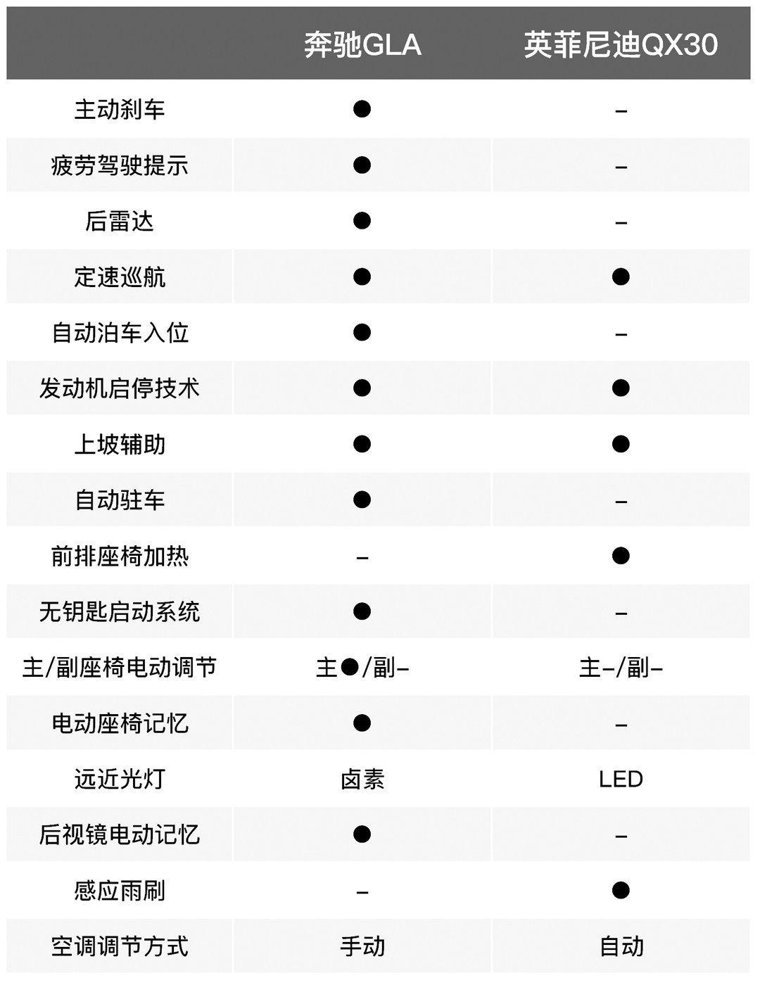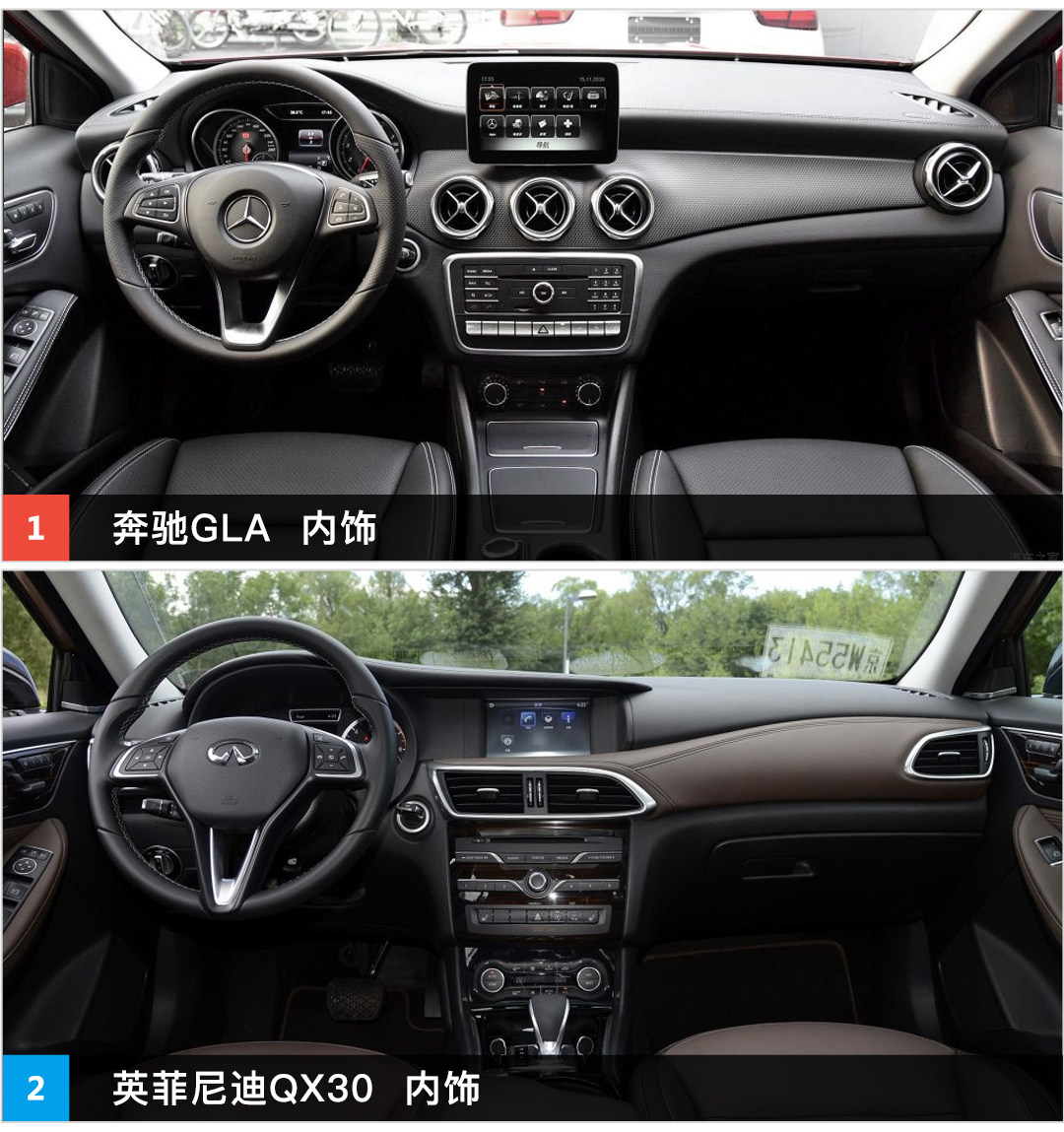 同平台车型,但车头悬挂的标不同意味着它们有着差异巨大的价格差异。英菲尼迪QX30相比GLA在起步指导价上要少了2万元。所以此次我们请出英菲尼迪QX30的次低配车型与GLA乞丐版车型进行配置对比。