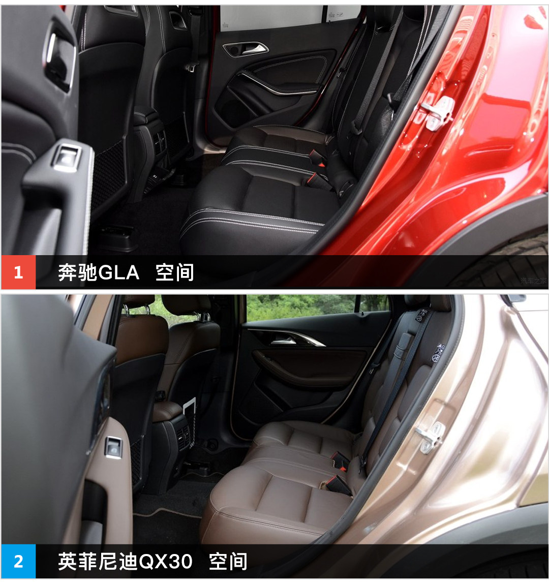 在空间部分有一个非常有趣的现象,两款来自同平台的“表兄弟”它们的储物空间几乎一模一样,储物能力非常接近。但由于QX30采用的是传统的排挡杆结构,而GLA是怀挡这就使得GLA比QX30多出了一个可观的储物空间。