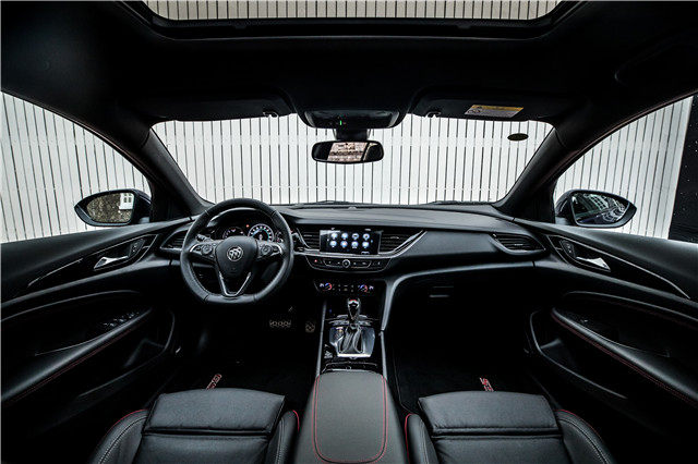 内饰呢?布局、设计都与普通版一样,但是为了凸显精致感与运动感,君威GS提供了全黑的带有红色缝线的内饰设计,不过全黑的内饰跟君威GS上的两个液晶屏幕的色调都不是太搭,如果液晶屏幕的颜色做得深沉一点就更好了。