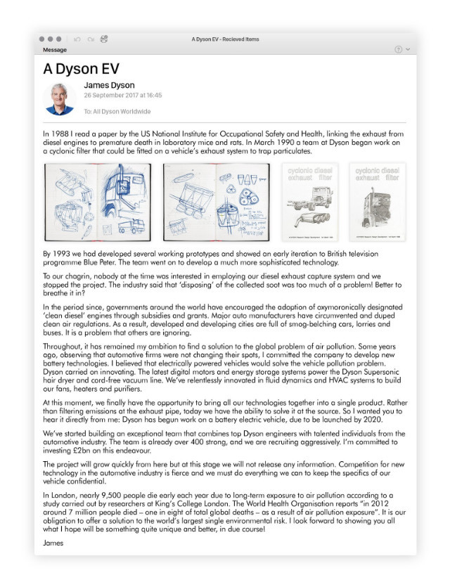 邮件中还透露,在接下来三年内戴森计划投资20亿英镑,并且于2020年推出自己的首款电动汽车。戴森还为此组建了一支超过400人的开发团队,其中包括戴森自己的工程师,以及从宝马、阿斯顿·马丁和特斯拉等企业挖过来的高级人才,其中一半会用于固态电池技术的研发上。