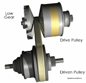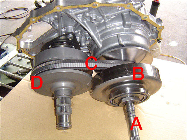这里就要先讲一下它的基本构造了,其实它的结构基本上是三种最主流的变速箱里最简单的,我们可以简单地将它看成一条钢链(以前有皮带的)跟两组大小可变的带轮。