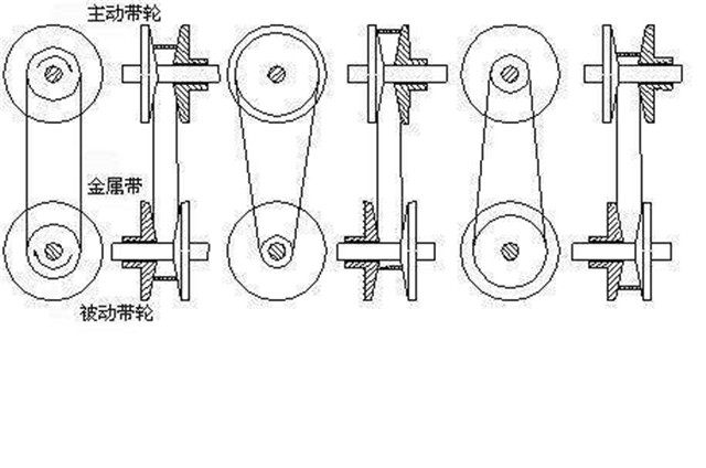 也就是说,每组带轮上两个相对放置的锥轮会根据电脑控制来运动,以此变换它们中间形成的凹槽的的宽度,宽度变化,那么钢带带动的直径也会相应变化,直径变化,于是带轮旋转一周的时间也会发生变化,也就是速度发生变化,于是这时候速比就发生变化了。