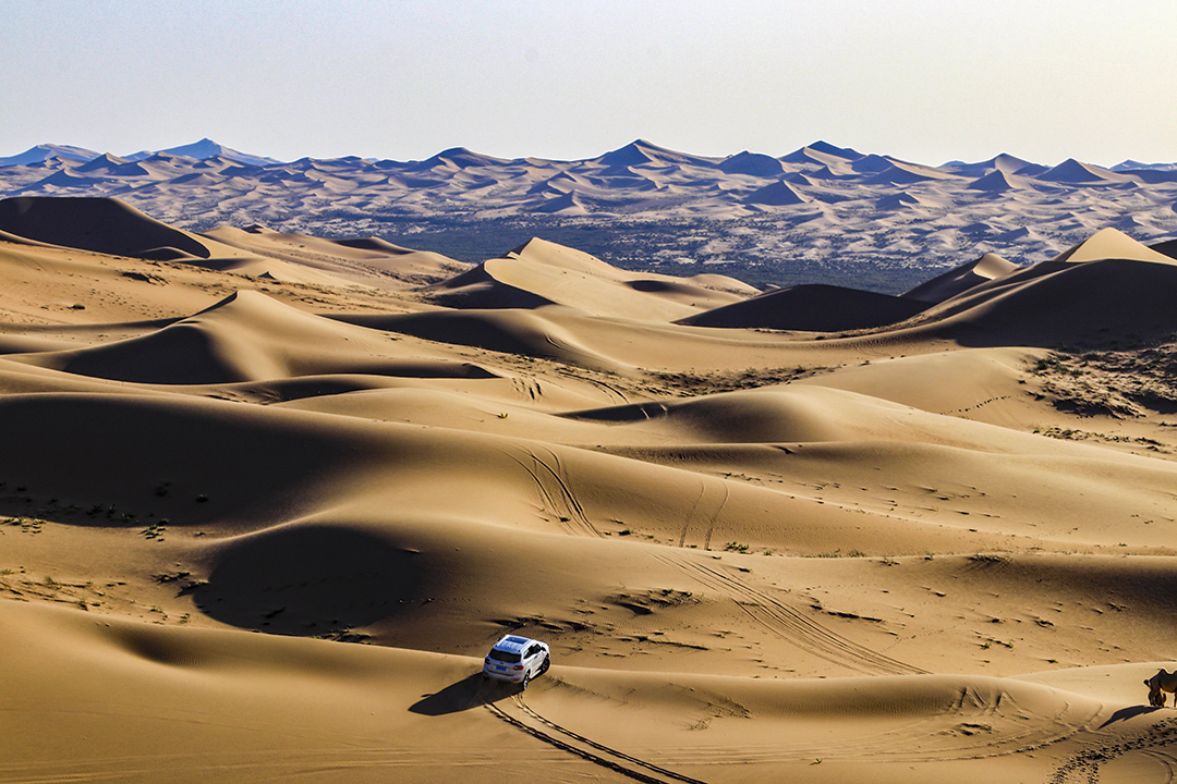 轮胎放气降低胎压,将TMS路况管理切换至沙地模式,关闭ESP,车队就开始向沙漠深处出发,得益于全时四驱和TMS路况管理系统,29.5°接近角,25°离去角,开着撼路者跑沙漠还是很轻松的,如果你想玩得再狂野一些,那么换一条竞技前杠是必须的,现场也有不少撼路者的车友都是这么做的。