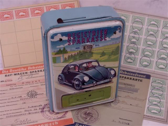于是,这台价格便宜、设计新潮、性能足够还能装下一家五口的家庭用车受到了全国上下的追捧。纳粹德国政府特意推出了一种类似集邮册的小册子,捐赠一个格子就能盖一个章,只要集邮册上所有的章都盖满,就可以拥有一辆车,当时德国政府有一句口号:“每周五马克,一年领新车”。