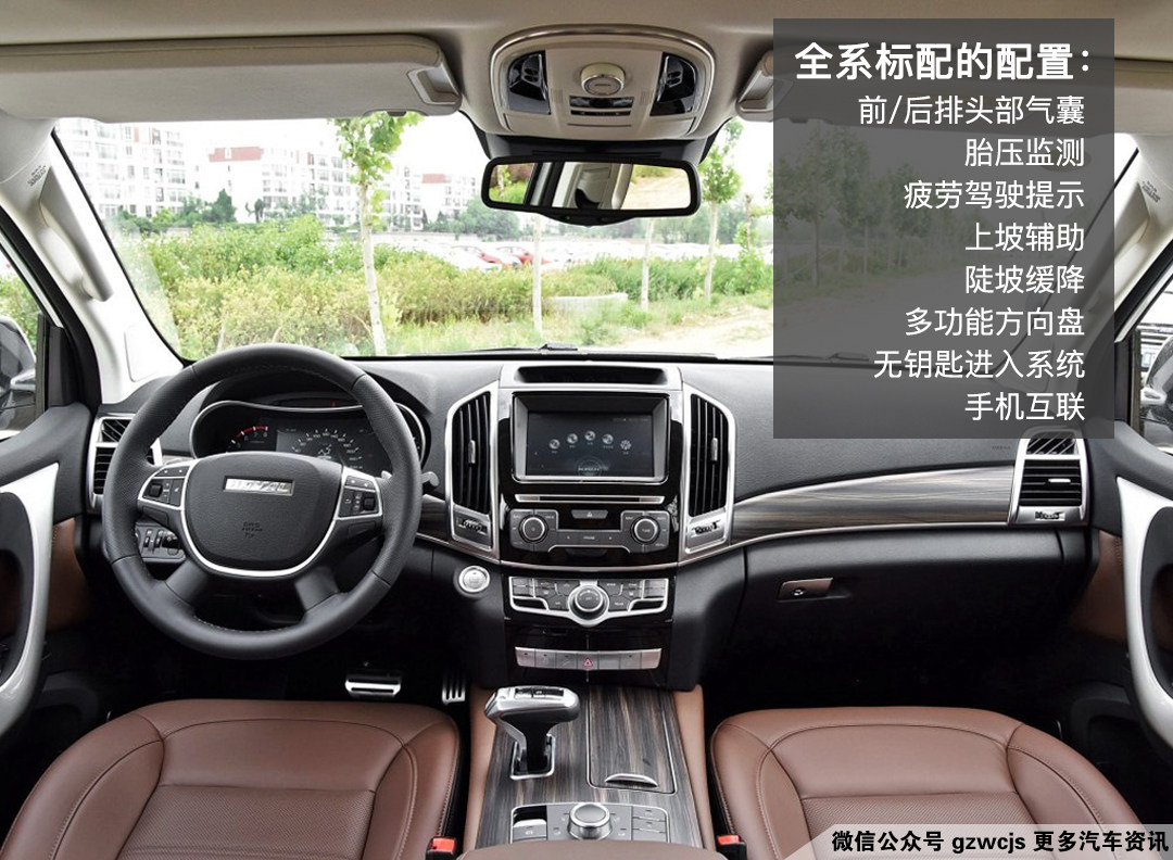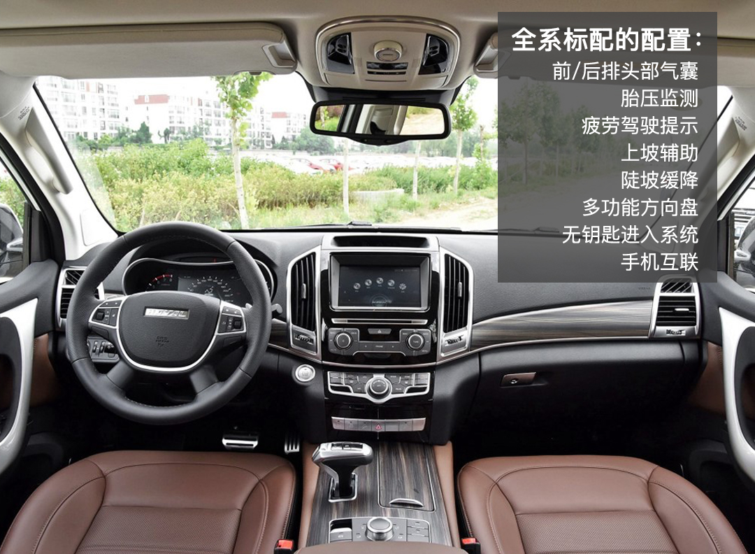 开始进入H9的时候我是坐在后排的,第一感觉是内饰的材料比较普通,座椅的皮质也不算细腻,后排座椅的腰部支撑也不是很足,所以乘坐的感受只能算一般。但来到前排之后,发现H9的虽然内饰的用料一般,但配置还是相当的厚道,像电子手刹、倒车影像、陡坡缓降等都是全系标配,相当厚道。