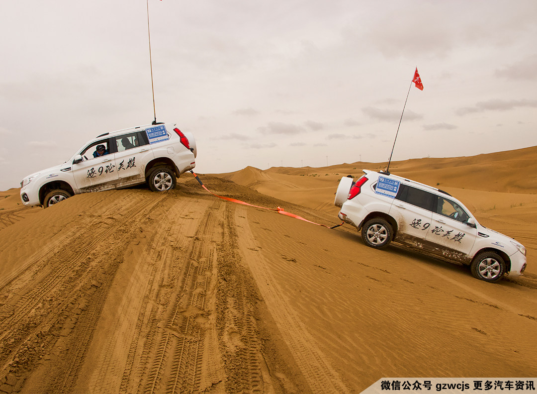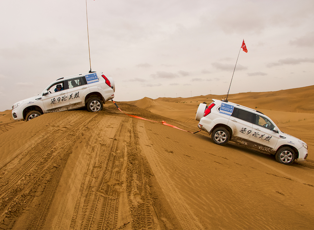 在穿越沙漠的过程中,车队中的其中一辆H9因为错误判断路线,在沙丘的顶部陷车了,车身中部被沙丘顶住,四个轮子都已经失去了附着力,这时候就只能通过拖车来把它救出来了。救援车停好之后,把拖车绳固定好,等人员都撤退到安全距离后,救援车一个急加速,就让陷入沙子里的H9脱困了。