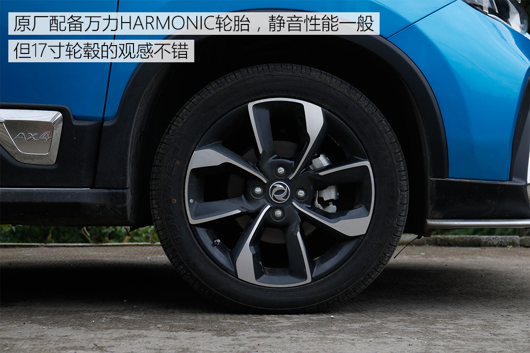 再往下看,就能看见AX4原厂配备了17英寸的万力HARMONIC轮胎,17寸的轮胎对于小型SUV来说刚刚好,视觉体验不错。略遗憾的是这条万力的轮胎在高速行驶时的胎噪还是比较明显的,建议车主后期改装其他牌子的静音胎。